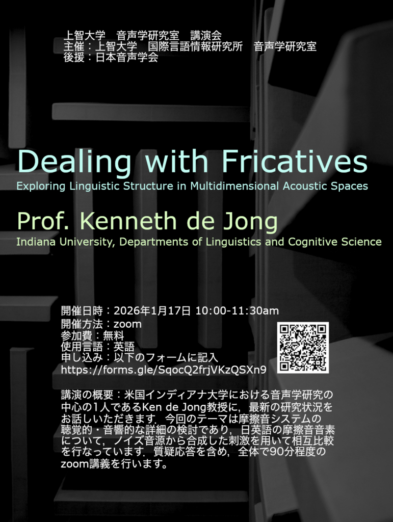 要旨:音声研究において、調音分析は、発話中の口腔内を計測することの難しさから、音響分析に比べ、数が少ない。本発表では、超音波診断装置を用いて計測した舌形状の分析結果の教育的、臨床的応用の可能性を例示する。さらに、第一・第二言語獲得理論、音韻理論等への応用事例を紹介する。調音と音響の関係についても言及する。